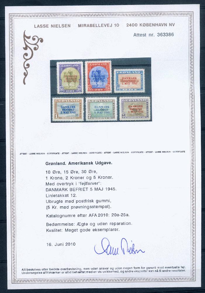 | Zusatzinformationen und Suchstichworte: | Skanfil Auktion - Frühling Auktion 2023 4. - 7. Mai 2023 Los 2532 Grönland 8-25a. Amerikansk Utgave, Danmark Befriet og "ændrede farver" (20a-25a). Tre fine postfriske serier - sidste med attest LN. (25400) Zuschlag 7.200,00 MOK |