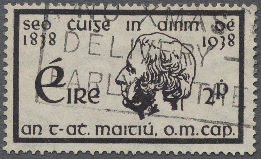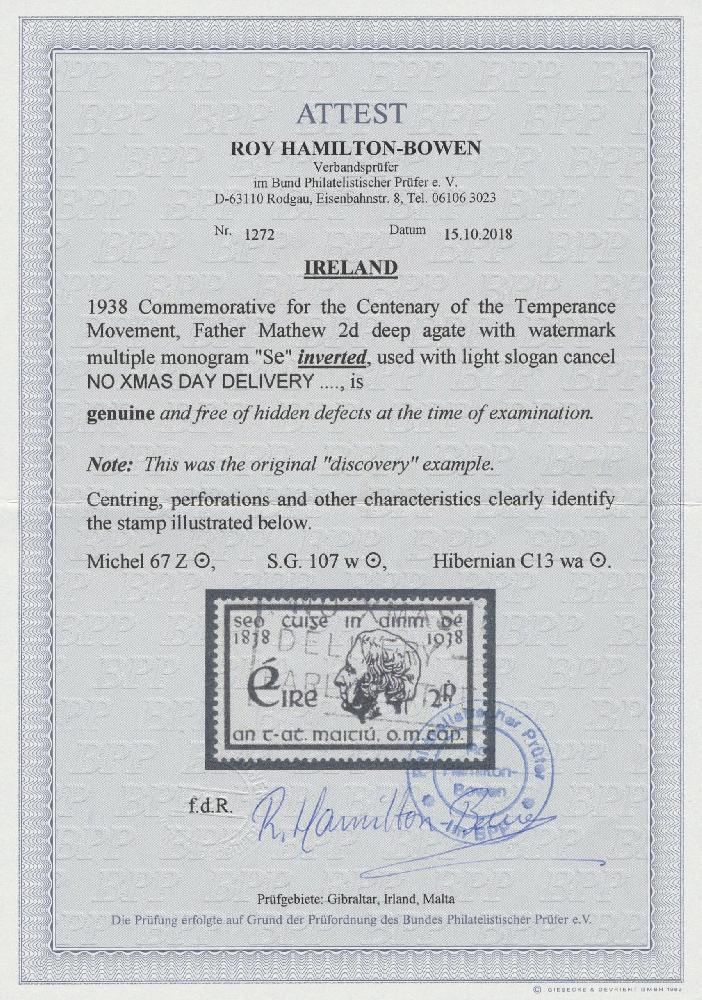 | Zusatzinformationen und Suchstichworte: | Auction Galleries Hamburg 29. Auktion 1. - 2. September 2023 Los 217 D Irland 1938, Temperance Crusade 100 years, 2 pg. agate with INVERTED watermark. Stamp neatly cancelled with flag cancel, on the right a shorter tooth, otherwise impeccable, otherwise according to photo-certificate Hamilton-Bowen the first specimen discovered with headed watermark. Very rare variety, Hibernian without price "RRR", hardly ever offered, Mi. value 2.500 €. ÷ 1938, Enthaltsamkeitsbewegung 100 Jahre, 2 Pg. violettbraun mit KOPFSTEHENDEM Wz. Marke sauber mit Fahnenstempel entwertet, rechts ein kürzerer Zahn, sonst tadellos, im übrigen laut Fotoattest Hamilton-Bowen das erste mit kopfstehendem Wz. entdeckte Exemplar. Sehr seltene Abart, Hibernian ohne Preis "RRR", wird kaum angeboten, Mi.-Wert 2.500 € Ausruf 450,00 EUR |