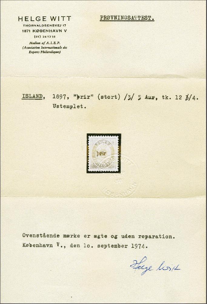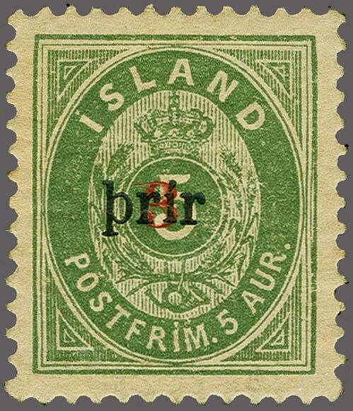 | Zusatzinformationen und Suchstichworte: | Corinphila Veilingen 257. Auktion 13. - 16. September 2023 Los 5285 Island 5 aur grün gezähnt 12¾ überdruckt mit "3" in rot und große "prir", sehr fein, mit Falz mit 1974 Helge Witt Attest, Katalog v. 750 Ausruf 120,00 EUR |