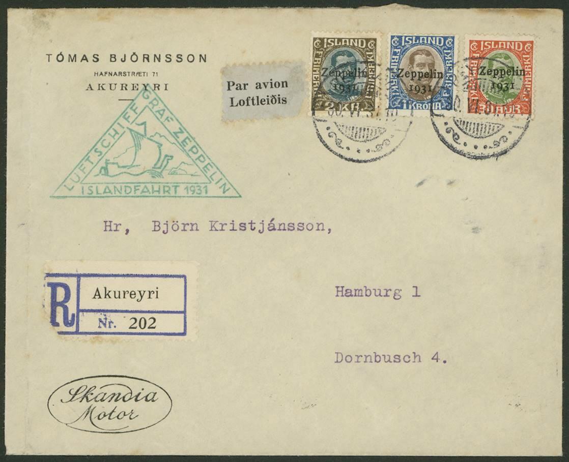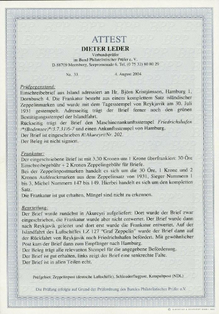 | Zusatzinformationen und Suchstichworte: | Ulrich Felzmann 37. e@uction 5. - 8. September 2023 Los 10533 Island Islandfahrt 1931, isländische Post, R-Brief mit allen drei Zeppelin Sondermarken komplett und R-Zettel AKUREYRI auf Umschlag einer Firma aus Akureyri, die Frankatur wie üblich gestempelt Reykjavik 30.6., geringe Spuren, etwas gebräunte Zahnspitzen, Flugstempel vs., Ankunft Friedrichshafen 3.7., weiter nach Hamburg mit Ankunft 4.7., einer von wenigen Belege, die nicht in Reykjavik aufgeliefert wurden, Fotoatest Leder BPP "... gehören zu den ganz besonderen Belegen der Islandfahrt" Ausruf 350,00 EUR |