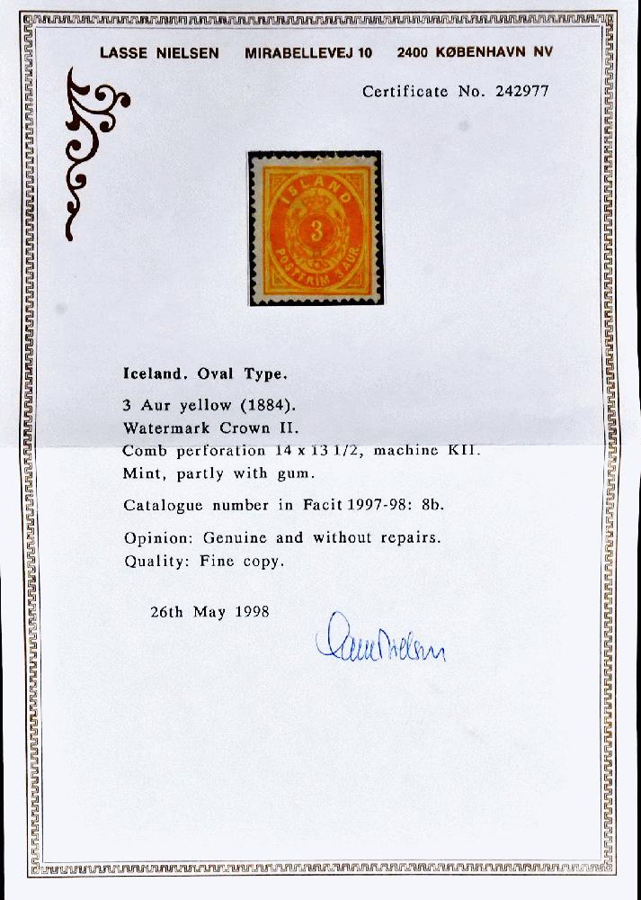 | Zusatzinformationen und Suchstichworte: | AB Philea "Extra" Auktion #2329 19. Juli 2023 Los 5919 Island Iceland, Facit 8b or AFA 12 or Scott 15 *, 1884 Aur values 3 aur orange-yellow perf 14 × 13½ on thin paper. Fine copy with cert. Lasse Nielsen. F 1500 Zuschlag 20,00 EUR |