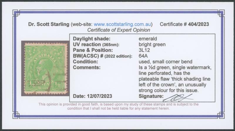 | Zusatzinformationen und Suchstichworte: | 253. Abacus Auktion 19. - 22. September 2023 Los 133 Australien - KGV - Single Watermark ½d blass smaragd ACSC 64A (SG 20a) mit nicht verzeichnet Abart verdickt Schraffurlinie nach links von Krone (Position 3L12), hell Maschinenstempel nicht auf der Abart, Katalogwert $900 + (£650 + ) für normal. Dieses Abart notiert ist in Dix und Rowntree (1995). Scott Stare Attest (2023) Ausruf 230,00 AUD |