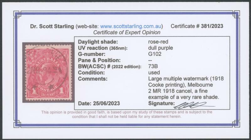 | Zusatzinformationen und Suchstichworte: | 253. Abacus Auktion 19. - 22. September 2023 Los 348 Australien - KGV - mehrfach Wasserzeichen groß 1d rosarot ACSC 73B (SG 49 nicht verzeichnet Farbton), hell aber klar Melbourne 2MR18 Maschinenstempel, Katalogwert $7500. Scott Stare Attest (2023) Bundesländer "ein schönes Stück von eine sehr seltene Farbton" Ausruf 1.500,00 AUD |