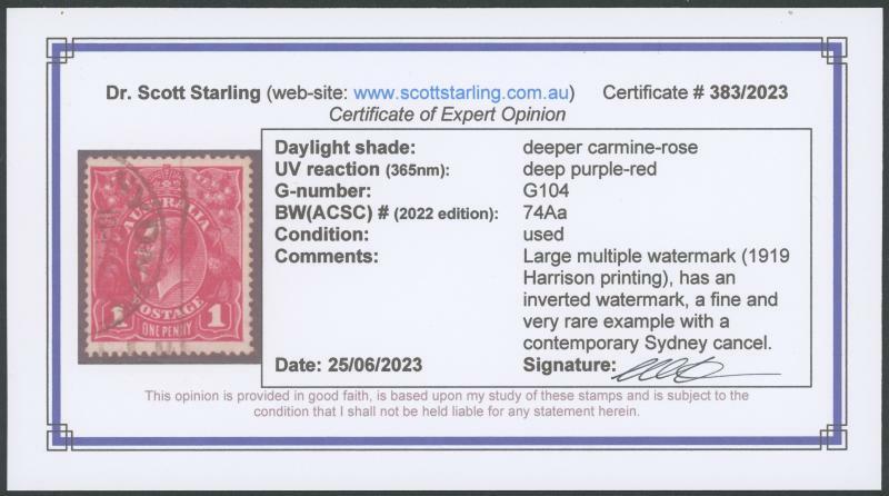 | Zusatzinformationen und Suchstichworte: | 253. Abacus Auktion 19. - 22. September 2023 Los 353 Australien - KGV - mehrfach Wasserzeichen groß 1d tief karminrosa mit dem Wasserzeichen kopfstehend ACSC 74Aa (SG 50aw), geradezu gut zentriert, teilweise Sydney Maschinenstempel, Katalogwert $5000 (£3000). Der ACSC gibt an, jenes "gestempelte Marken sind sehr selten" . Die erste Exemplar das wir angeboten haben in mehr als zwanzigjährigen, wenn zwei weniger gut zentriert verkauften Stücken zu unser Versteigerung von 19,7,2003 für $5376 und $5600 jeweils. Scott Stare Attest (2023) Bundesländer "eine schöne und sehr seltenes Stück mit ein zeitgenössisch Sydney Stempel" Ausruf 3.800,00 AUD |
