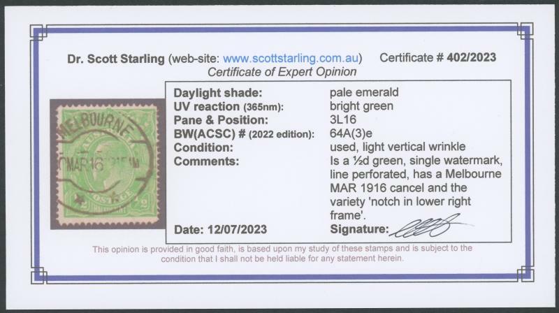 | Zusatzinformationen und Suchstichworte: | 253. Abacus Auktion 19. - 22. September 2023 Los 117 Australien ½d hellgrün mit Kerbe in richtigem Rahmen 5mm oben Lower-Right Ecke und zusätzlich mit weißen Fleck in Rahmen zu oben links Ecke (Position 3L16) ACSC 64Be, Melbourne 10MAR16 Maschinenstempel nicht auf der Abart, Katalogwert $1500. Scott Stare Attest (2023) Ausruf 380,00 AUD |