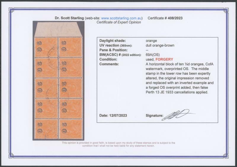 | Zusatzinformationen und Suchstichworte: | 253. Abacus Auktion 19. - 22. September 2023 Los 262 Australien - KGV - mehrfach Wasserzeichen klein überdruckt OS: ½d orange kopfstehend Klischee mithin mit der Überdruck kopfstehend als ACSC 69 (OS) c (SG O128a), zu sein die zentral Einheit in der unteren Reihe einer Randblockstück von 10 (5x 2) vom rechten Bogenrand, und sowie tête-bêche mit die drei angrenzend Einheiten, repariert Einriß nur im Rand, die Briefmarken Pracht & gut zentriert, Gefälligkeitsstempel mit Perth Kreisdatumsstempel von 13JE33 Kreisdatumsstempel, Katalogwert $27,500 + für ein gestempelte Einzelmarke. Ex TE Feld, Hans Kilfoyle (aber nicht angeboten in seiner Versteigerung Verkauf) und Julie Resch. Letzter verkauft zu die Macray Watson Versteigerung von 25,7,1995 für $990. die beeinflusst Einheit ist nicht ein offiziellem eingefügt Briefmarke auswechseln ein geschädigte Einheit, welches ist die einzige Weg in welches der ACSC gibt an, jenes Überdruck kopfstehend ist vorgefunden. Wegen die orientation, der Schlüssel Einheit sowie hat die Wasserzeichen kopfstehend, welches ist nicht verzeichnet für diese Ausgabe. an der Front Verkauf von 15,11,1948 (verkaufte unbeschädigt bei Kilfoyle) die Artikel war beschriebenen als "... äußerst selten, nur drei Stücke gemeldet bestehen" und abgeschätzt zu £100-150 (ungefähr gleichbedeutend wie jede von den vier KGV 1d Abzüge vom Urstempel angeboten im Verkauf). Macray Watson angegeben jenes "unser Meinung ist das die Einheit in Frage ist ein komplett Fälschung - design, Wasserzeichen und Aufdruck - und vielleicht ein verkannt Sperati" . Scott Stare Attest (2023) Bundesländer "fachmännisch abgeändert" Ausruf 750,00 AUD |
