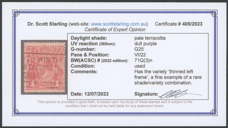 | Zusatzinformationen und Suchstichworte: | 253. Abacus Auktion 19. - 22. September 2023 Los 280 Australien 1d blass terracotta (Ziegel) Platte 3 mit verdünnt linkem Rahmen (Position VI/22) ACSC 71Q (3) n, hell Maschinenstempel leicht stoßend auf die Abart, Katalogwert $900 für die Kombination von seltener Farbton und Abart (siehe ACSC p 73 Zusammenstellung). Scott Stare Attest (2023) Ausruf 230,00 AUD |