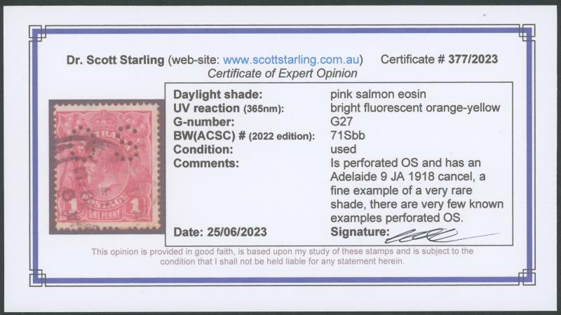 | Zusatzinformationen und Suchstichworte: | 253. Abacus Auktion 19. - 22. September 2023 Los 321 Australien Punktierte OS: 1d salmon-eosin ACSC 71Sbb, leicht derangiert Adelaide JA 9/18 Kreisdatumsstempel, kleines grünlich mark auf Rückseite sichtbarer vom Gesicht auf einem Zahn Spitze nur, Katalogwert $4000 (p 74 Zusammenstellung). Scott Stare Attest (2023) bestätigt die Farbton und Bundesländer "eine sehr seltene Farbton, es gibt nur sehr wenige bekannt Stücke gezähnt OS" Ausruf 600,00 AUD |