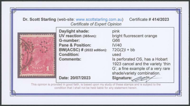 | Zusatzinformationen und Suchstichworte: | 253. Abacus Auktion 19. - 22. September 2023 Los 344 Australien Punktierte OS: 1d rosa Platte 2 mit dünn G von Porto Retuschen (Position IV/40) ACSC 72Gbb (2) l, small-part Hobart Kreisdatumsstempel gut nicht auf der Abart, Katalogwert $400 + für ungepunzte. Scott Stare Attest (2023) Ausruf 115,00 AUD |