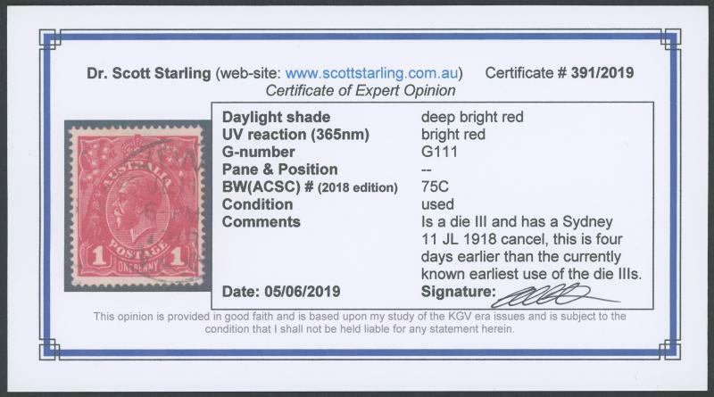 | Zusatzinformationen und Suchstichworte: | 253. Abacus Auktion 19. - 22. September 2023 Los 366 Australien Frühste verzeichnete Datum: 1d tief lebhaftrot ACSC 75C, geradezu gut zentriert, hell aber klar Sydney 11JL/1918 Maschine datehead Stempel. Der ACSC gibt an, jenes "die Briefmarken gedruckt wurden in January-April 1917 ... (aber) ... wären unverausgabte bis Juli 1918, der früheste bekannte Datum zu sein 15 Juli 1918" . Scott Stare Attest (2019) Bundesländer "dieses ist vier Tage früher als die augenblicklich bekannt frühster Verwendung der Die IIIs" Ausruf 150,00 AUD |