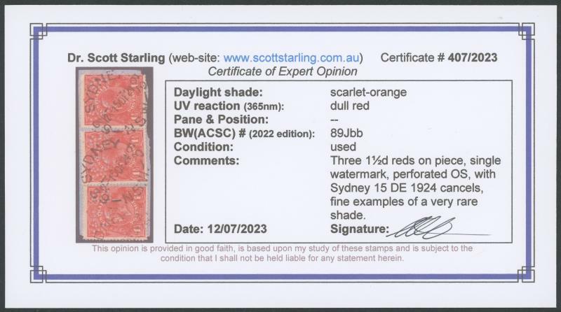 | Zusatzinformationen und Suchstichworte: | 253. Abacus Auktion 19. - 22. September 2023 Los 447 Australien - KGV - mehrfach Wasserzeichen klein Punktierte OS: 1½d scarlet-orange ACSC 89Jbb (SG O80 nicht verzeichnet Farbton) drei Einzelmarken entwertet auf kleinem Briefstück bei SYDNEY/39/15DE24/NSW Kreisdatumsstempel, Katalogwert $900. ein sehr ausgeprägt und seltener Farbton. Scott Stare Attest (2023) bestätigenden die Farbton Ausruf 190,00 AUD |