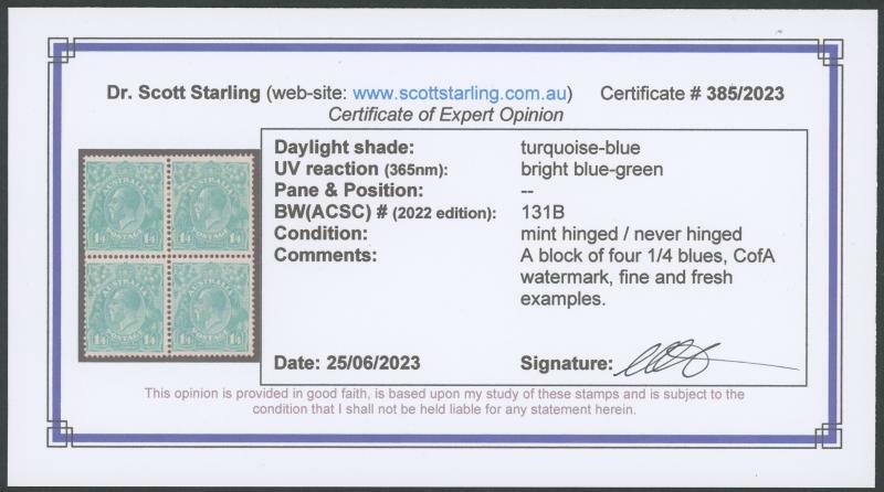 | Zusatzinformationen und Suchstichworte: | 253. Abacus Auktion 19. - 22. September 2023 Los 548 Australien - KGV - CofA Wasserzeichen 1/4d turquoise-blue ACSC 131B (SG 131 Farbton) Viererblock, oberen Einheiten mit ein kleiner Falzrest, die untere Einheiten postfrisch, Katalogwert $2500 + für zwei postfrisch und zwei montiert Einzelmarken. Scott Stare Attest (2023) bestätigenden die Farbton Ausruf 380,00 AUD |