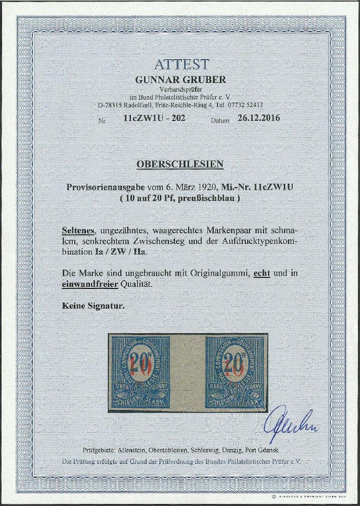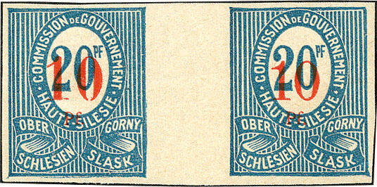 | Zusatzinformationen und Suchstichworte: | Aufdrucktype Ia / IIa, Zwischenstegpaar ungezähnt Jürgen Götz e.K. Internationales Auktionshaus, 394. Auktion (31.08.-02.09.2021), Los 3424, Ausruf 500,00 Euro, Zuschlag nicht verkauft auf der Auktion. Quelle: https://www.philasearch.com/de/i_9383_182329/310_Oberschlesien/9383-A394-3424.html? |