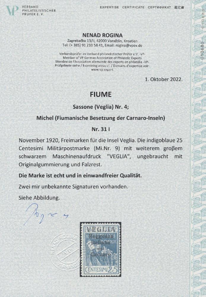 | Zusatzinformationen und Suchstichworte: | Auction Galleries Hamburg 29. Auktion 1. - 2. September 2023 Los 176 D Fiume Besetzung der Carnaro-Inseln 1920, Freimarke mit großem Aufdruck für die Insel Veglia. 25 Centesimi blau in ungebrauchter Erhaltung mit Altsignatur. Laut Fotoattest Rogina VP ist die Marke echt, ungebraucht und in einwandfreier Qualiät. Michel 700,- Euro Ausruf 150,00 EUR |