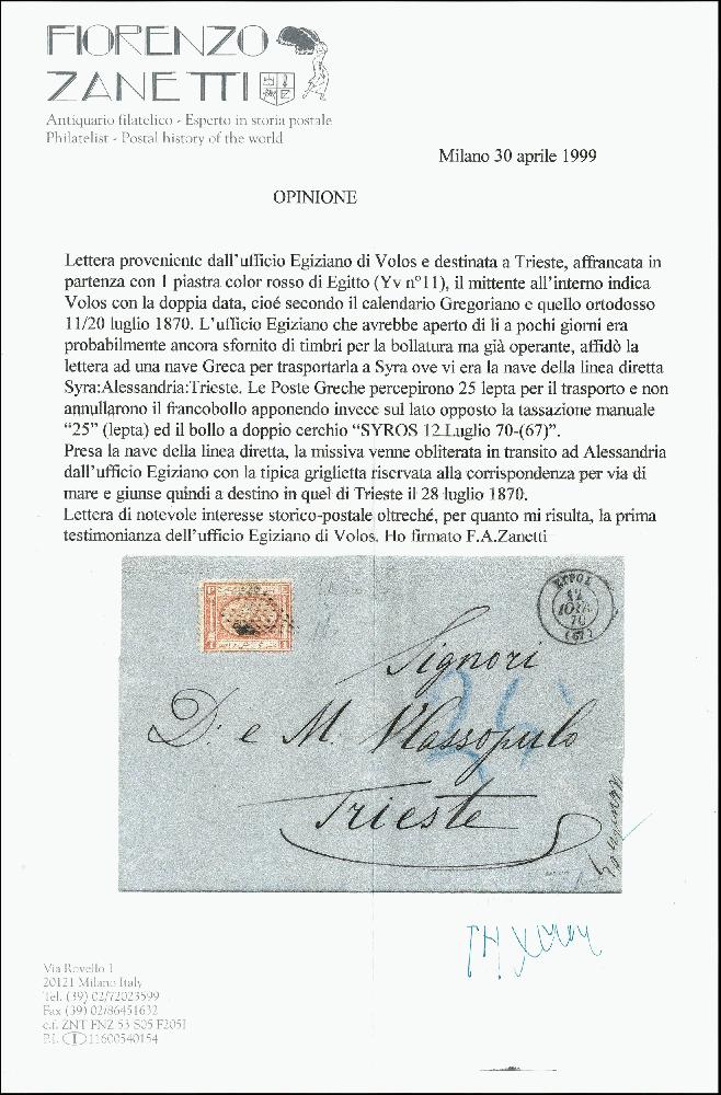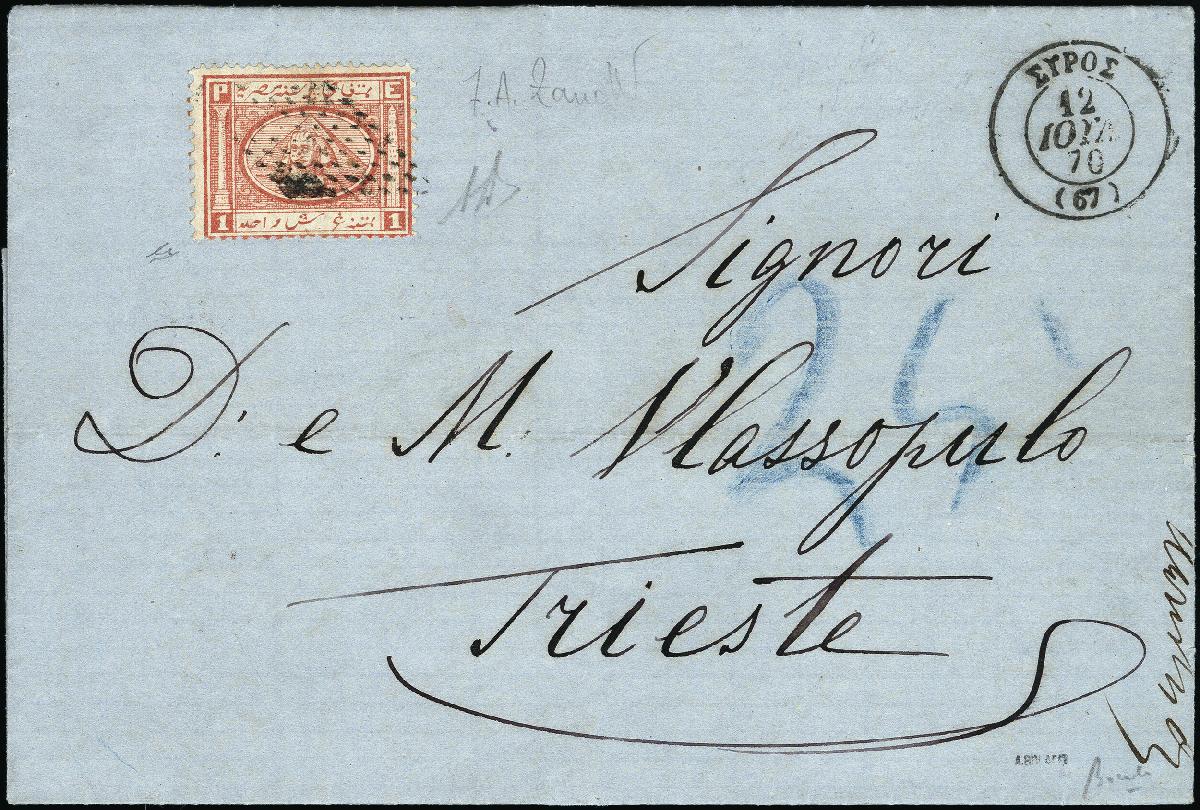 | Zusatzinformationen und Suchstichworte: | Heinrich Köhler 382. Auktion 18. - 23. September 2023 Los 1841 Ägypten (Königreich) 1867, 1 pi. red, tied by black 'retta' as the Volos Consular Post Office datestamp had yet to be placed in use, to entire letter from Volos to Trieste, dated inside '11/23 July 1870' (Gregorian resp. Julian calender), franked with Egypt The cover travelled with the Khedivial Mail Line to Syros with frontside "SYROS 12 JULY 70", rated '25' lepta in blue crayon (equal to 10 kreuzer to be paid by the recipient) and was forwarded to the Austrian Lloyd express line from Constantinople to Triest.; on reverse Trieste arrival cds (July 28). An outstanding and unique entire - the Consular Office on Volos was announced to open on July 14, 1870, thus this cover was mailed on the second of the (weekly) services. Signed A. Diena, A. Bolaffi and Todd, Certificate F. Zanetti (1999). Ausruf 3.000,00 EUR |