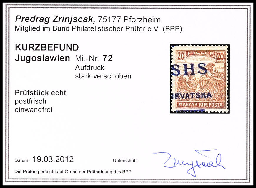 | Prüfer: | Zrinjšćak, Predrag (BPP (Bund Philatelistischer Prüfer)) |