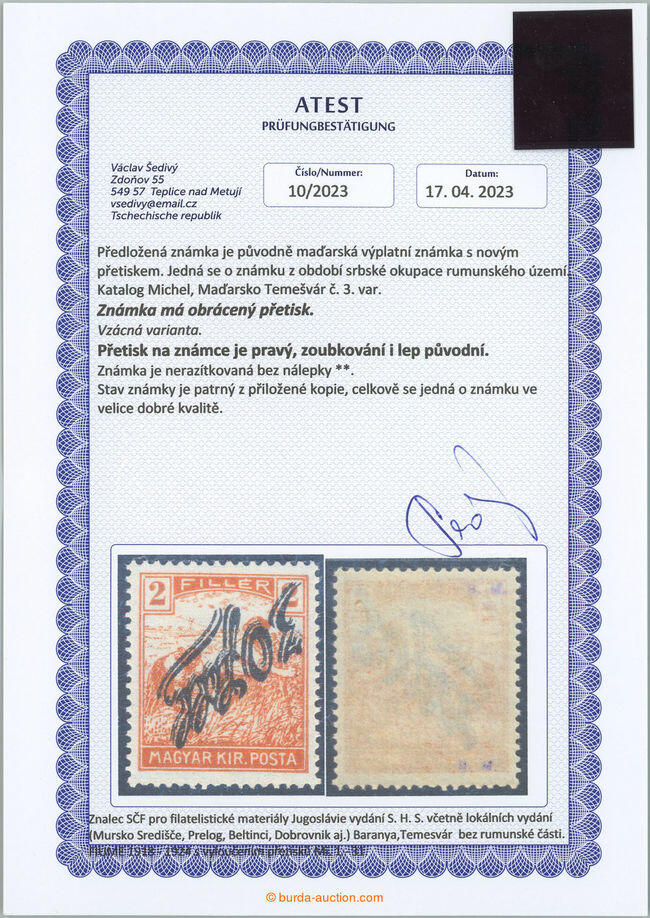 | Zusatzinformationen und Suchstichworte: | Burda 72. Auktion 16. - 17. September 2023 Los 103 Ungarn 919 TEMESVAR/Mi. 3 Produktion Fehler, Schnitterin 2f ocker mit kopfstehendem Aufdruck 30 füllen. ; postfrisch, Besitzers mark, Attest Sedivy, selten Ausruf 213,00 EUR |