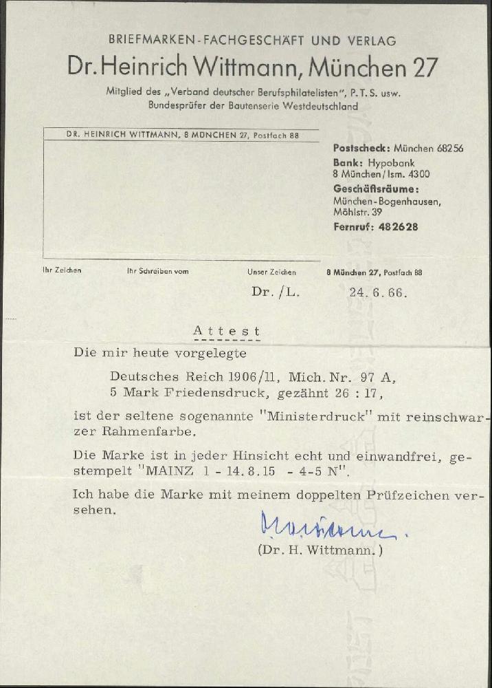 | Zusatzinformationen und Suchstichworte: | Gert Müller 119. Auktion 24. - 26. August 2023 Los 4090 Deutsches Reich, Germania mit WZ 5 Mk. als seltener sogenannter Ministerdruck mit schwarzem statt schwarzgrünem Rahmen, farbfrisch und sehr gut gezähnt, gest. in perfekter Erhaltung, Fotoattest Dr. Wittmann. Mi. 2000,- € Ausruf 800,00 EUR |