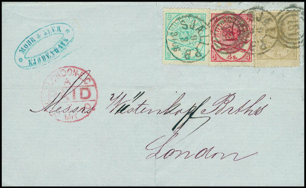 | Zusatzinformationen und Suchstichworte: | Gert Müller 119. Auktion 24. - 26. August 2023 Los 3161 Dänemark 2 Sk. blau, 4 Sk. rot und 8 Sk. gelbbraun, gezähnt K 13:12 1/2, farbfrisch und tadellos als portogerechte Dreifarben-Frankatur auf Brief, Empfängername verändert, Umschlag gefaltet, mit Duplex-Stempel "181 SJAELL.P.B. 9.3.(1870)" der Bahnpost, nach London mit rotem Transitstempel. Eine seltene und attraktive Frankatur! Fotoattest Witschi Ausruf 400,00 EUR |