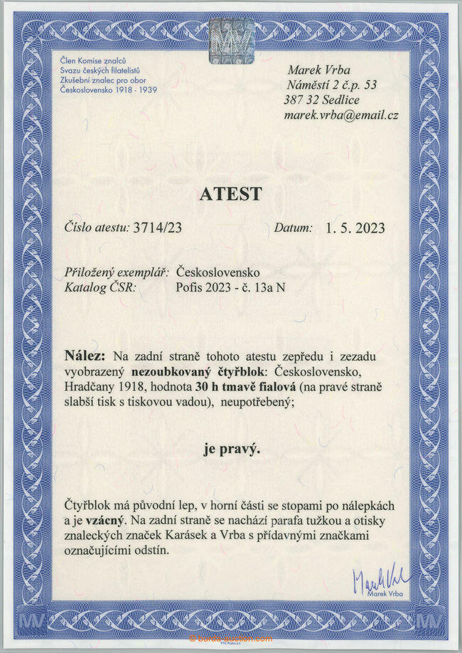 | Zusatzinformationen und Suchstichworte: | Burda 72. Auktion 16. - 17. September 2023 Los 2150 Tschechoslowakei 1918-1939 Pof. 13Na, 30h dunkelviolett in 4-BLOKU (!) ; die unten Paar Marken postfrisch ohne Falz, Attest Vrba und Karasek, dekorative und sehr seltene Einheit passendem zu jeder groß Sammlung! Ausruf 3.405,00 EUR |