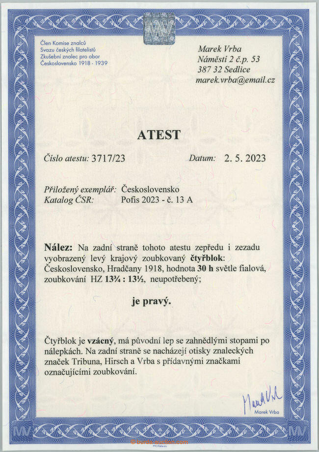 | Zusatzinformationen und Suchstichworte: | Burda 72. Auktion 16. - 17. September 2023 Los 2215 Tschechoslowakei 1918-1939 Pof. 13A, 30h violett, 4-BLOK mit L Rand mit seltenem Kamm gezähnt 13¾ : 13½; zwei Marken postfrisch ohne Falz postfrisch, 2x schwerer braun gefalzt, Attest Vrba, exp. Tribuna und Hirsch, blockweise außerordentlich gesucht! Ausruf 4.250,00 EUR |