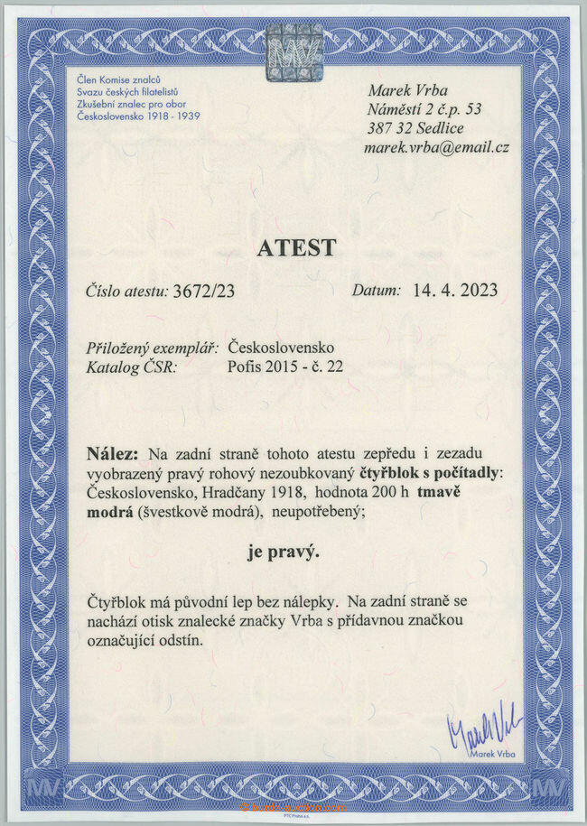 | Zusatzinformationen und Suchstichworte: | Burda 72. Auktion 16. - 17. September 2023 Los 2158 Tschechoslowakei 1918-1939 Pof. 22c, 200h dunkelblau , LR Ecke 4-BLOK S POCITADLY (!) ; Pracht Einheit, Attest und geprüfte Vrba, seltenes Angebot Eckrandviererblock in seltenem Faarbton Werten 200h in außergewöhnlich Qualität! Ausruf 2.128,00 EUR |