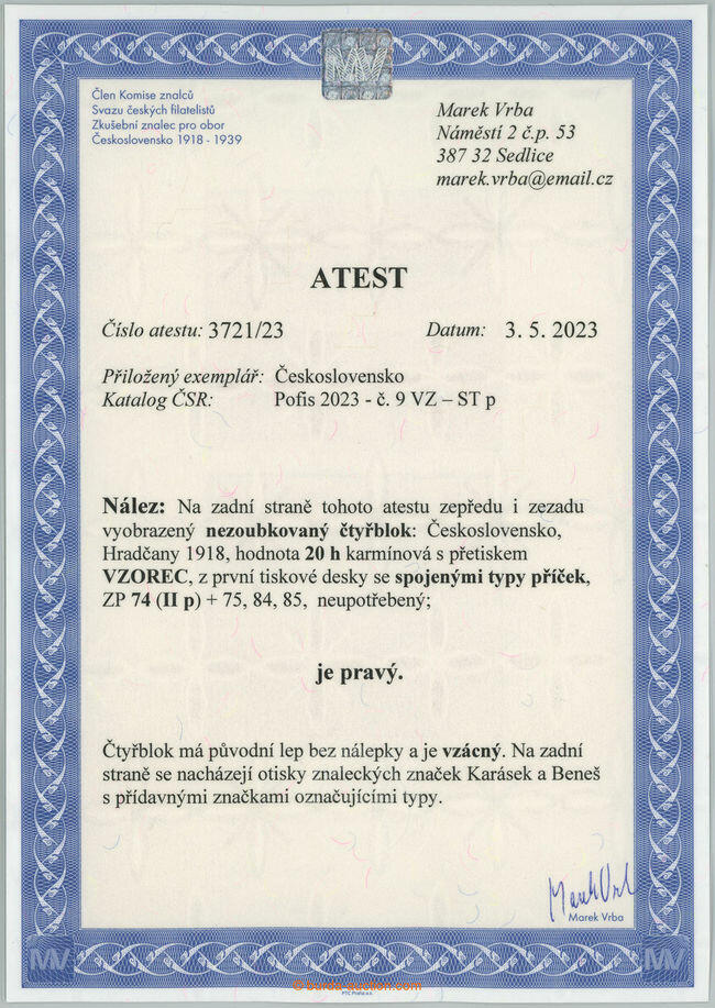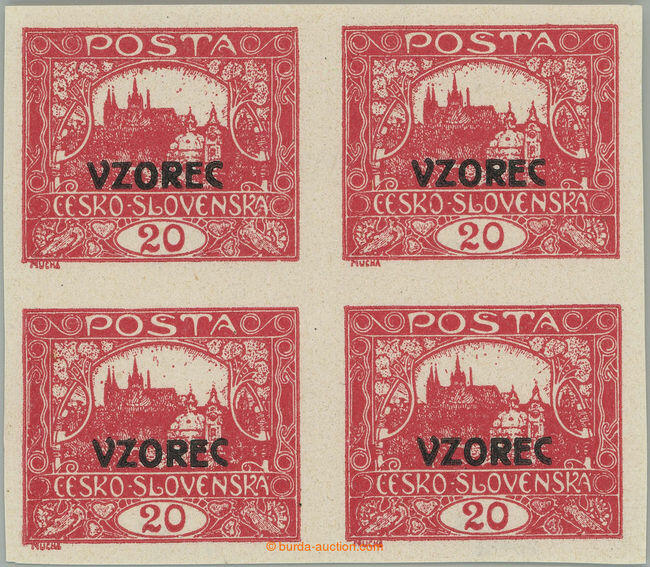 | Zusatzinformationen und Suchstichworte: | Burda 72. Auktion 16. - 17. September 2023 Los 2184 Tschechoslowakei 1918-1939 Pof.9Nvz joined bar types, 20h carmine, block of four with overprint VZOREC with very rare SPOJENYM PRICKOVYM type, stmp field 74-75 / 84-85, printing plate 1, bar type II on pos. 74; superb mint never hinged, certificate Vrba, expertized Karasek and Benes, extraordinary piece nezoubkovaneho block of four values 20h carmine with overprint VZOREC with joined bar types, skvela item to every specialized collection and only stezi repeatable offer! Ausruf 6.383,00 EUR |