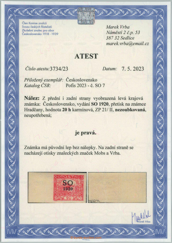 | Zusatzinformationen und Suchstichworte: | Burda 72. Auktion 16. - 17. September 2023 Los 2257 Tschechoslowakei 1918-1939 Pof. SO7,20h karmin ungezähnt mit L Rand; postfrisch postfrisch, nur im Rand geprägt Abdruck Büro Büroklammer, Attest Vrba, geprüfte Mobs, Kabinettbriefstück! Ausruf 639,00 EUR |