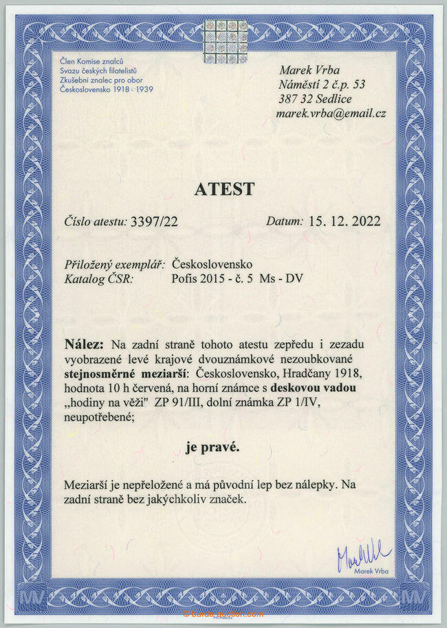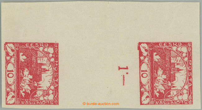| Zusatzinformationen und Suchstichworte: | Burda 72. Auktion 16. - 17. September 2023 Los 2363 Tschechoslowakei 1918-1939 Pof. 5Ms (2), 10h rot, senkrecht gleiche gegenüberstehende ungefaltet 2-stamps Zwischensteg mit L Rand, auf/für obere Marke. Plattenabart - Uhr in Turm; postfrisch, kleiner Gummifehler, insgesamt Kabinettbriefstück, Attest Vrba Ausruf 341,00 EUR |