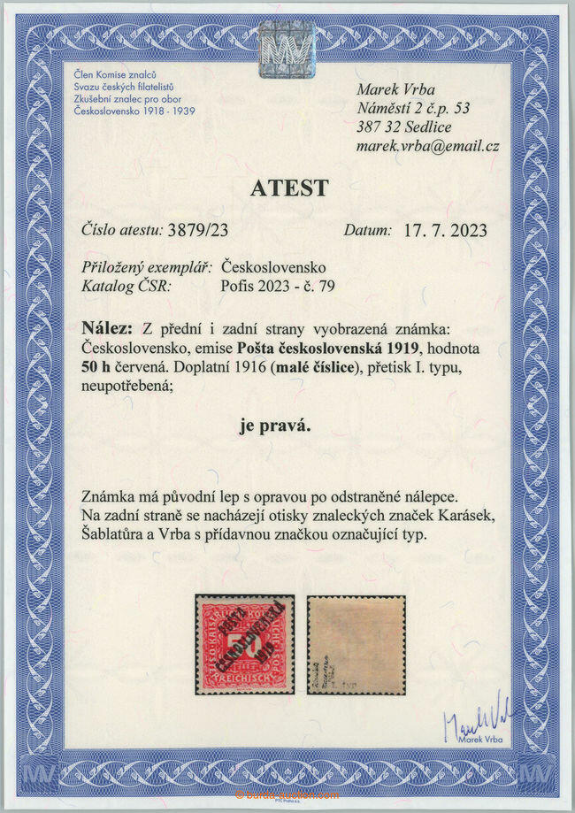 | Zusatzinformationen und Suchstichworte: | Burda 72. Auktion 16. - 17. September 2023 Los 2540 Tschechoslowakei 1918-1939 Pof. 79, kleine Ziffern 50h rot, Type I. ; Tip von entfernt Aufklebezettel, Attest Vrba, exp. Bei Karasek. Sablatura, insgesamt schönes Stück Ausruf 511,00 EUR |