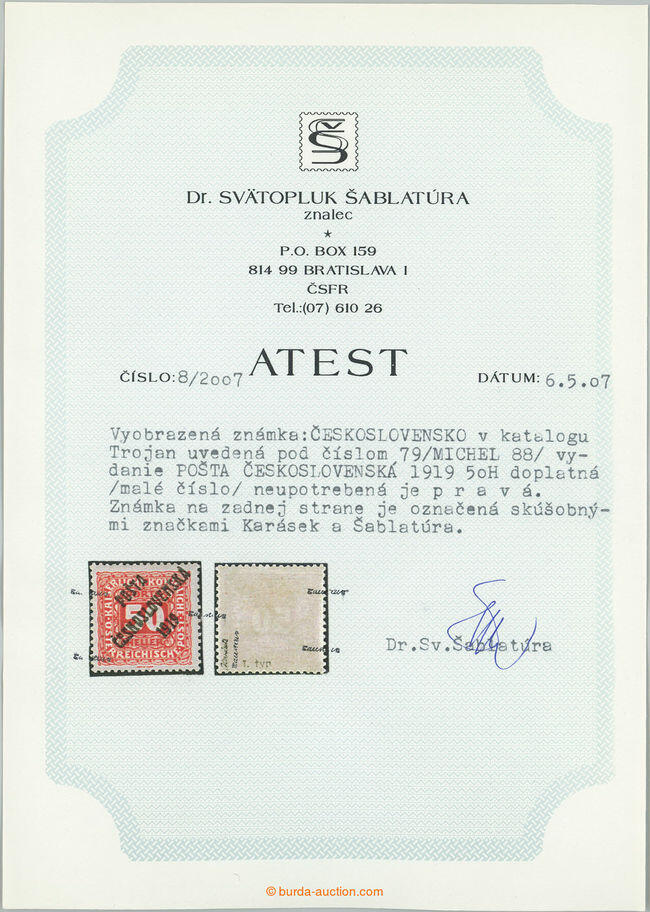 | Zusatzinformationen und Suchstichworte: | Burda 72. Auktion 16. - 17. September 2023 Los 2540 Tschechoslowakei 1918-1939 Pof. 79, kleine Ziffern 50h rot, Type I. ; Tip von entfernt Aufklebezettel, Attest Vrba, exp. Bei Karasek. Sablatura, insgesamt schön Stück Ausruf 511,00 EUR |