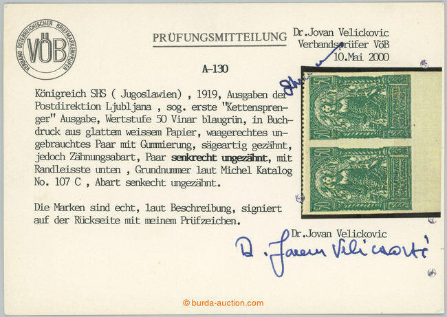 | Zusatzinformationen und Suchstichworte: | Burda 72. Auktion 16. - 17. September 2023 Los 73 Jugoslawien 19219 Ausgabe für Slowenien/Mi. 107C, Allegorien 50Vin, waagrechtes Paar mit Unterrand mit Produktion Fehler - fehlede verticale Zähnung; gefalzt, Attest Velikovic Ausruf 52,00 EUR |