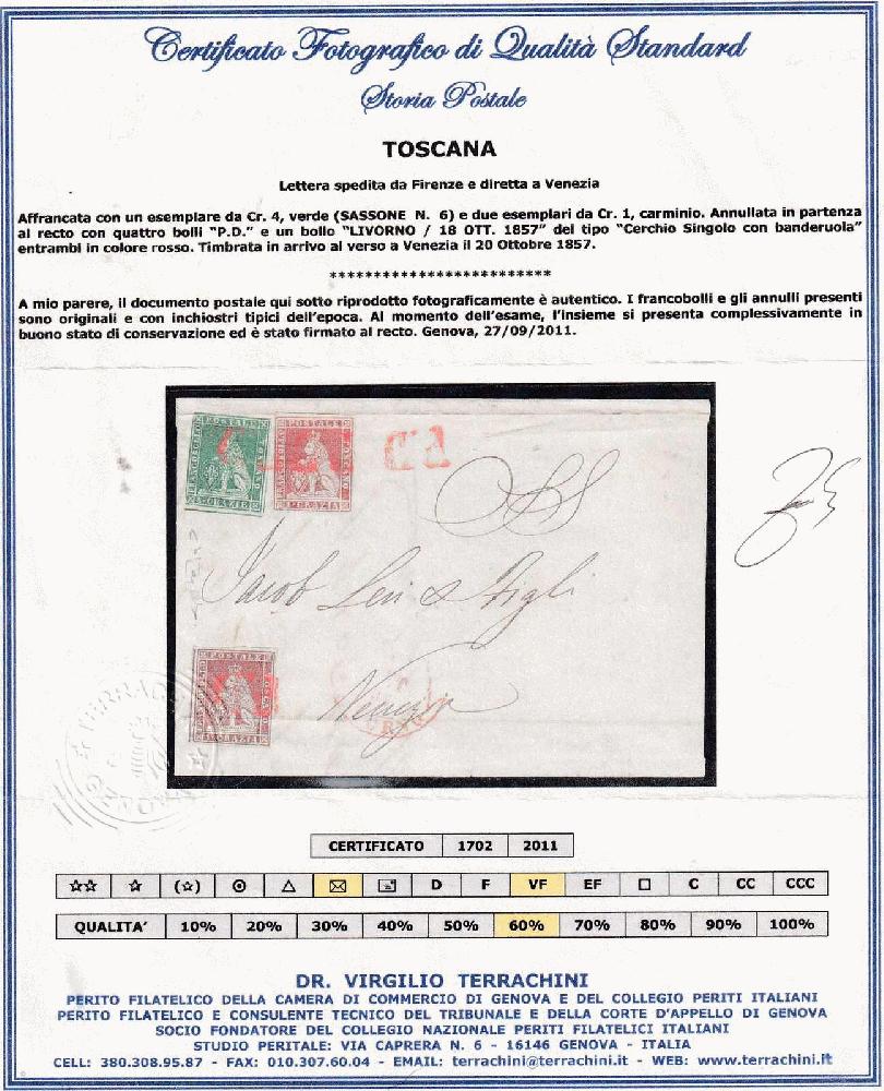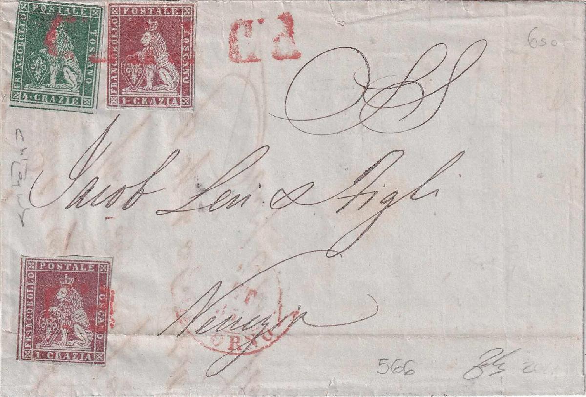 | Zusatzinformationen und Suchstichworte: | Leandra Honegger Briefmarken 18. August 2023 Los 94 Italien, Region Toskana (Toscana) 1857, 4Cr. grün, leicht berührter Schnitt, mit zwei Stück 1Cr.braunkarmin, je vollrandig, untere Marke mit waagr. Bugspur, als 4Cr. Frankatur auf Faltbrief von Livorno nach Venedig, rs. AK-Stempel. FA Dr. Virgilio Terrachini Ausruf 300,00 CHF |