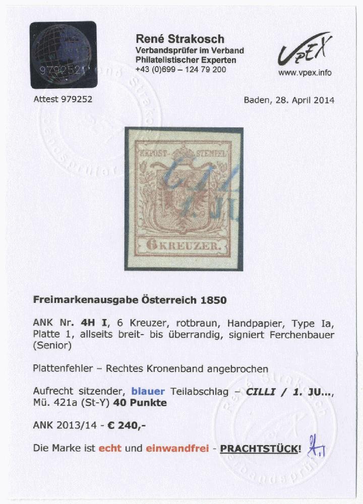 | Zusatzinformationen und Suchstichworte: | 72. Deider Auktion 29. Juni - 1. Juli 2023 Los 2304 Österreich FRÜHVERWENDUNGEN DER AUSGABE 1850 "CIL(LI)/1. JU(NI)", blauer Teil-L2 auf frischem, breitrandigem Kabinettstück 6 Kr. rotbraun, vermutlich Ersttags-Entwertung, sign. Paul Ferchenbauer sowie Fotobefund Strakosch. Ausruf 120,00 EUR |