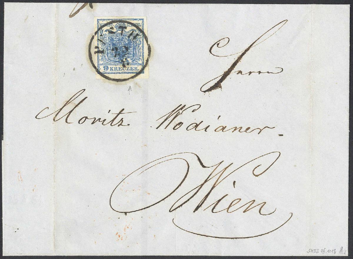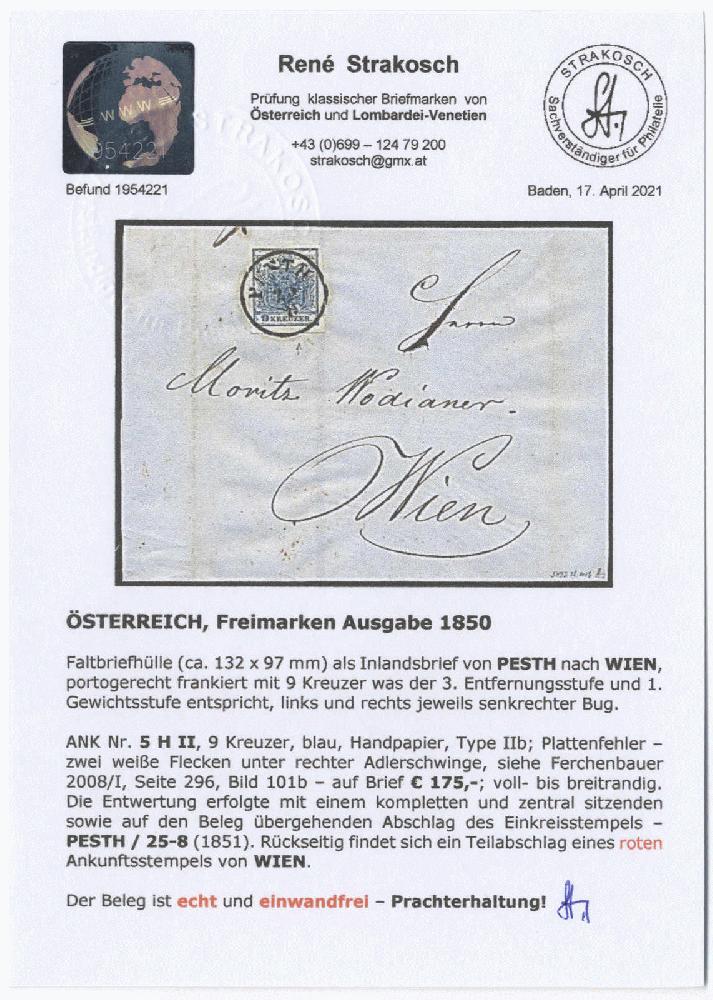 | Zusatzinformationen und Suchstichworte: | 72. Deider Auktion 29. Juni - 1. Juli 2023 Los 2396 Österreich Ausgabe 1850 9 Kr. blau, rundum gut gerandet mit kl. Plattenfehler und zentr. klarem K1 "PESTH" 1851 nach Wien, sign. und Fotobefund R. Strakosch. Zuschlag 40,00 EUR |