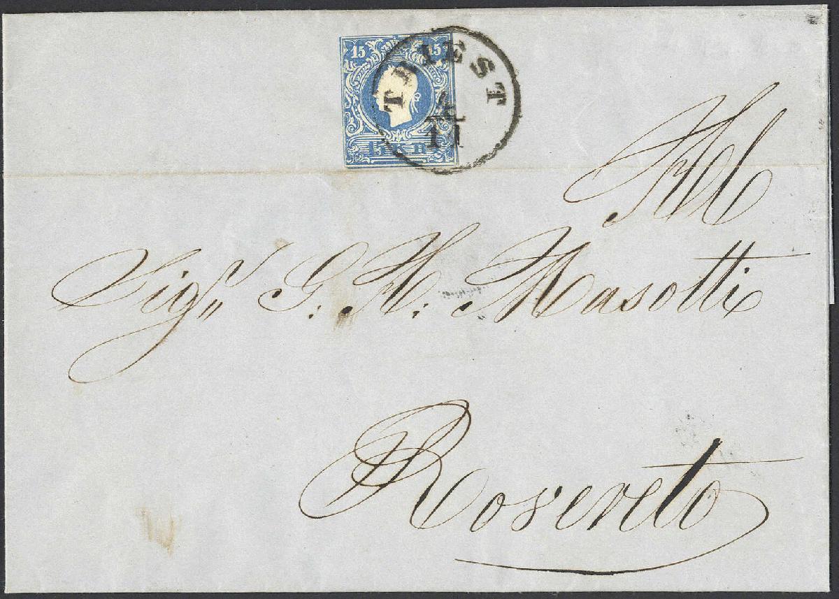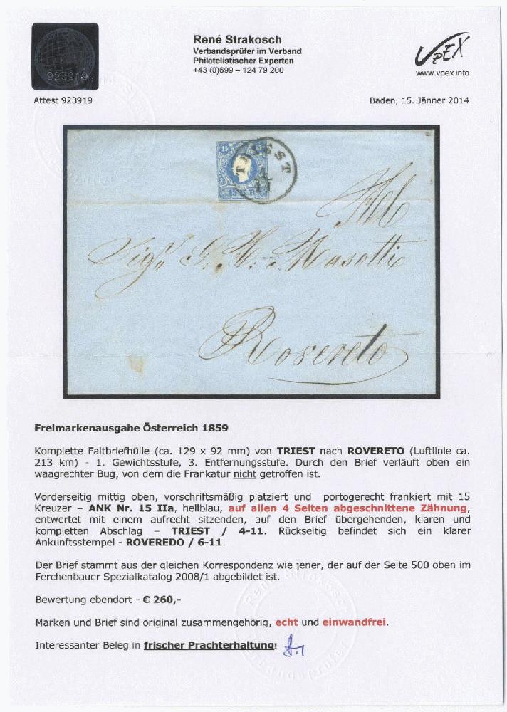 | Zusatzinformationen und Suchstichworte: | 72. Deider Auktion 29. Juni - 1. Juli 2023 Los 2536 Österreich Ausgabe 1858 15 Kr. blau, auf allen 4 Seiten abgeschnittene Zähnung, mittig plaziert auf Faltbriefhülle mit klarem, kompl. K1 "TRIEST" nach Rovereto, Fotoattest Strakosch. Ausruf 80,00 EUR |
