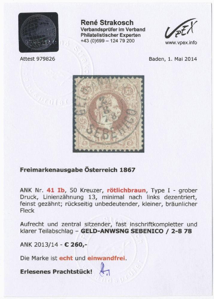 | Zusatzinformationen und Suchstichworte: | 72. Deider Auktion 29. Juni - 1. Juli 2023 Los 2604 Österreich Ausgabe 1867 50 Kr. rötlichbraun, grober Druck, Kabinettstück feinst gez. in LZ 12, mit zentr. klarem Geldanweisungs-Stpl. "SEBENICO", Fotobefund Strakosch. Zuschlag 90,00 EUR |