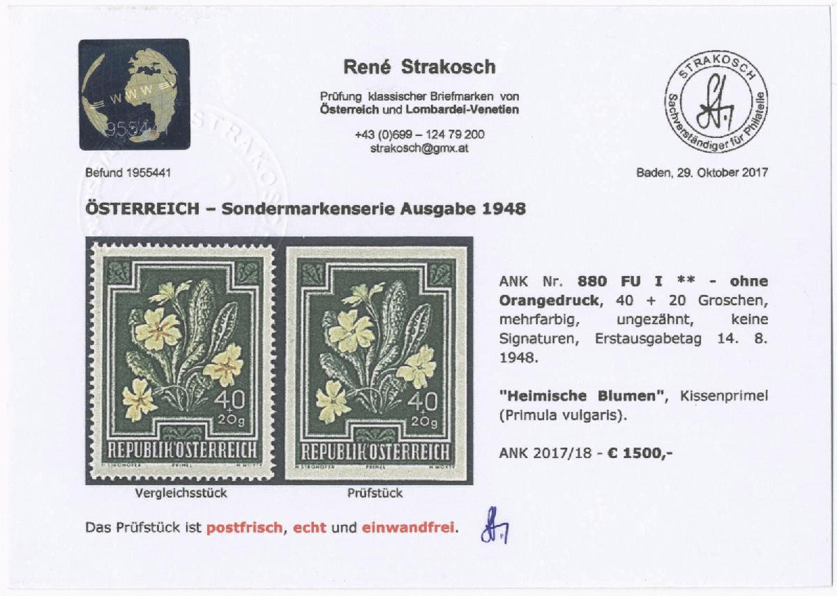 | Zusatzinformationen und Suchstichworte: | 72. Deider Auktion 29. Juni - 1. Juli 2023 Los 3013 Österreich 2. Republik 1948, Blumen 40+20 Gr., feinst postfrisches Kabinettstück, ungezähnt/ohne Orangedruck, mit Originalvergleichsstück, Fotobefund Strakosch. Ausruf 300,00 EUR |