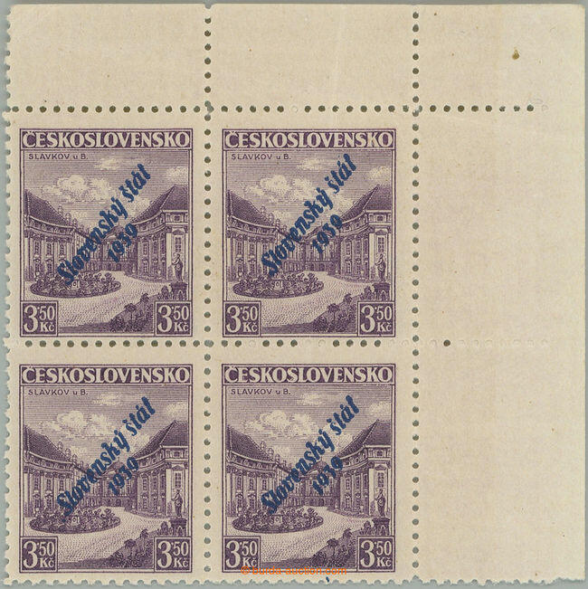 | Zusatzinformationen und Suchstichworte: | Burda 72. Auktion 16. - 17. September 2023 Los 3195 Slowakei 1939-45 1939 Sy. 19b, Slavkov 3,50CZK violett, blau Aufdruck, UR Ecke blk-of-4 mit nur selten mit vyskytujicim SIROKYM Rand, I. Abweichend, Aufdruckfeld 9-10 und 19-20; postfrisch, kleines senkrecht und Schrägstrich Knick, Attest Synek, geprüfte Sablatura, wirklich selten Eintritt, noch bekannt nur zwei Stück, außergewöhnliches Angebot! Ausruf 852,00 EUR |