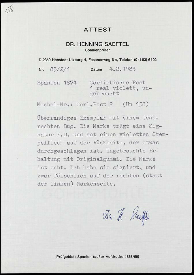 | Zusatzinformationen und Suchstichworte: | Soler y Llach - 791. Auktion - Spanien, Kolonien und der Rest der Welt 13. - 14. September 2023 Los 1330 Spanien Carlistische Post ESPAÑA. 1 real violeta. Amplios márgenes. Doblez vertical. Cert. SAEFTEL. Ed.158. Cat. 415€ Ausruf 40,00 EUR |