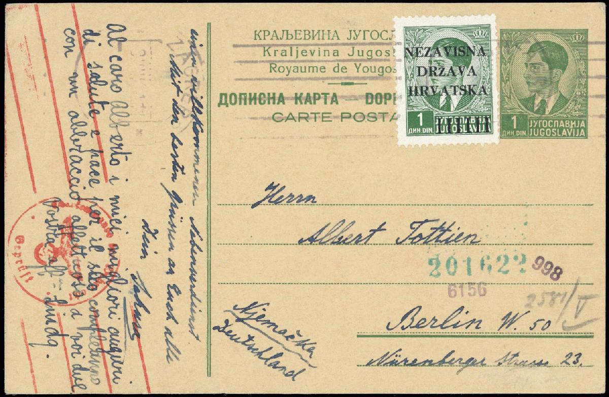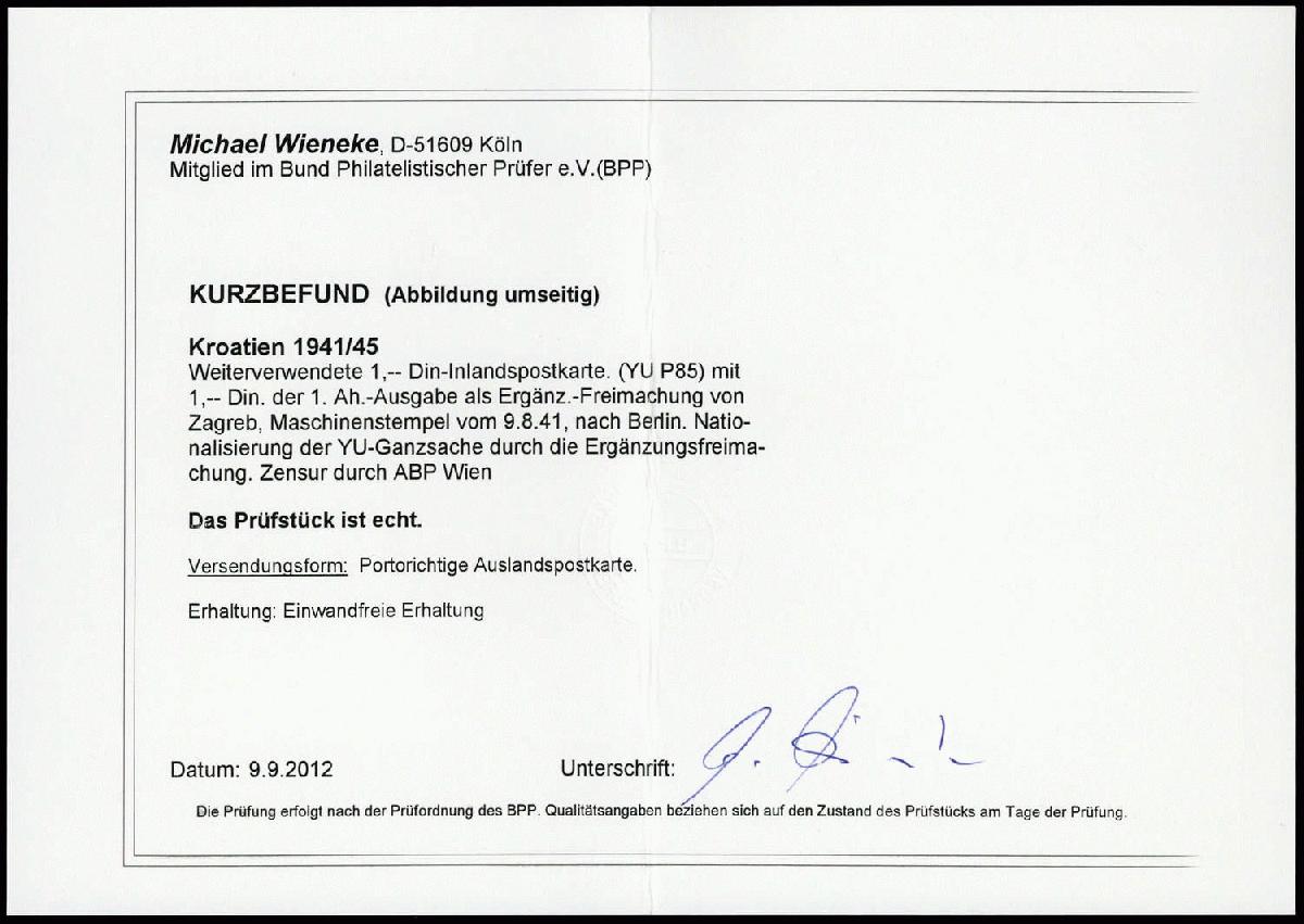 | Zusatzinformationen und Suchstichworte: | 76. Badische Briefmarken GmbH Auktion 27. Juni 2023 Los 16513 D Kroatien 1941, Weiterverwendete 1,-- Din.- Inlandspostkarte, "König Peter" mit 1,-- Din. der 1. Ah.-Ausgabe als Ergänzungsfreimachung von Zagreb mit Maschinenstempel vom 9.8.41 nach Berlin. Nationalisierung der YU-Ganzsache durch die Ergänzungsfreimachung. Zensur durch ABP Wien, Kurzbefund Wieneke BPP GEBOT |