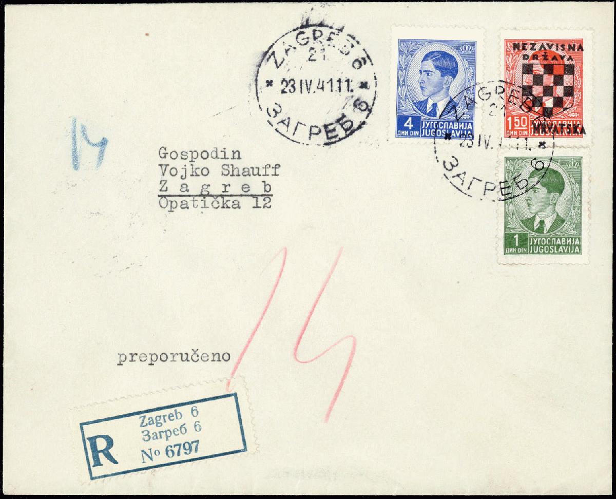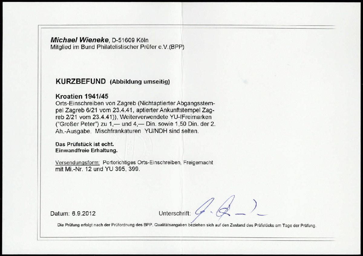| Zusatzinformationen und Suchstichworte: | 76. Badische Briefmarken GmbH Auktion 27. Juni 2023 Los 16535 D Kroatien 1941, Orts-Einschreiben von Zagreb, Nichtaptierter Abgangsstempel Zagreb 6/21 vom 23.4.41, aptierter Ankunftsstempel Zagreb 2/21 vom 23.4.41, Weiterverwendete YU-Freimarken "Großer Peter" zu 1,-- und 4,-- Din. sowie 1,50 Din. der 2. Ah.-Ausgabe. Mischfrankaturen YU/NDH sind selten. Kurzbefund Wieneke BPP Zuschlag 51,00 EUR |