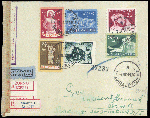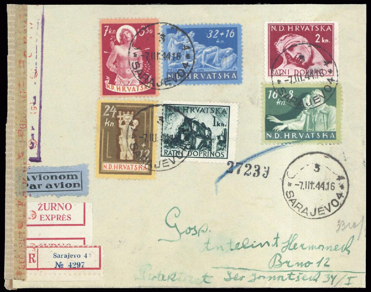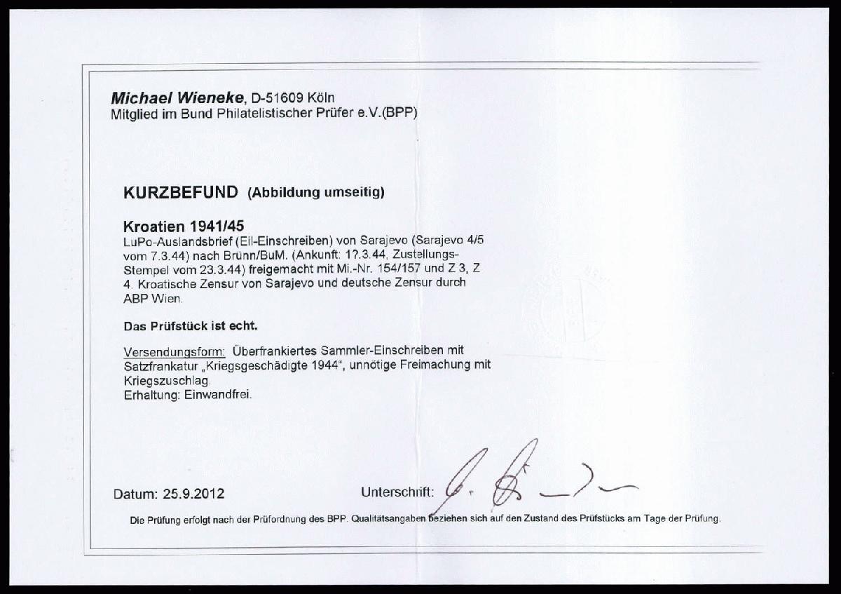 | Zusatzinformationen und Suchstichworte: | 76. Badische Briefmarken GmbH Auktion 27. Juni 2023 Los 16738 D Kroatien 1944, Luftpost-Auslandsbrief als Eil-Einschreiben von Sarajevo 4/5 vom 7.3.44 nach Brünn/BuM. Ankunft: 1?.3.44, Zustellungs-Stempel vom 23.3.44, freigemacht mit Serie "Kriegsgeschädigte 1944" sowie 1,-- und 2,-- Kn.-Kriegszuschlag. Überfrankiertes Sammler-Einschreiben mit Satzfrankatur „Kriegsgeschädigte“, unnötige Freimachung mit Kriegszuschlag. Kroatische Zensur von Sarajevo und deutsche Zensur durch ABP Wien. Umschlag zweiseitig geöffnet, Kurzbefund Wieneke BPP Zuschlag 30,00 EUR |