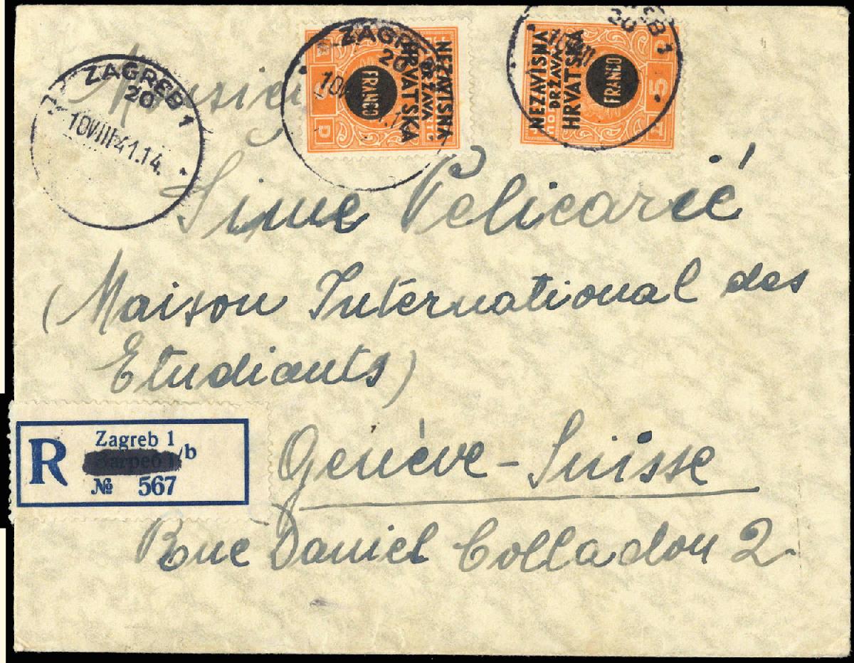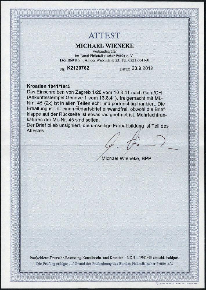 | Zusatzinformationen und Suchstichworte: | 76. Badische Briefmarken GmbH Auktion 27. Juni 2023 Los 16586 D Kroatien 1941, Einschreiben von Zagreb 1/20 vom 10.8.41 nach Genf/CH, Ankunftsstempel Geneve 1 vom 13.8.41, freigemacht mit 2x 5,-- Din.-3. Ah.-Ausgabe, portorichtig frankiert. Mehrfachfrankaturen der 5,-- Din. auf Bedarfsbriefen vor allen Auslandsbriefen sind selten, Farbfotoattest von dem Experten Wieneke BPP Zuschlag 40,00 EUR |