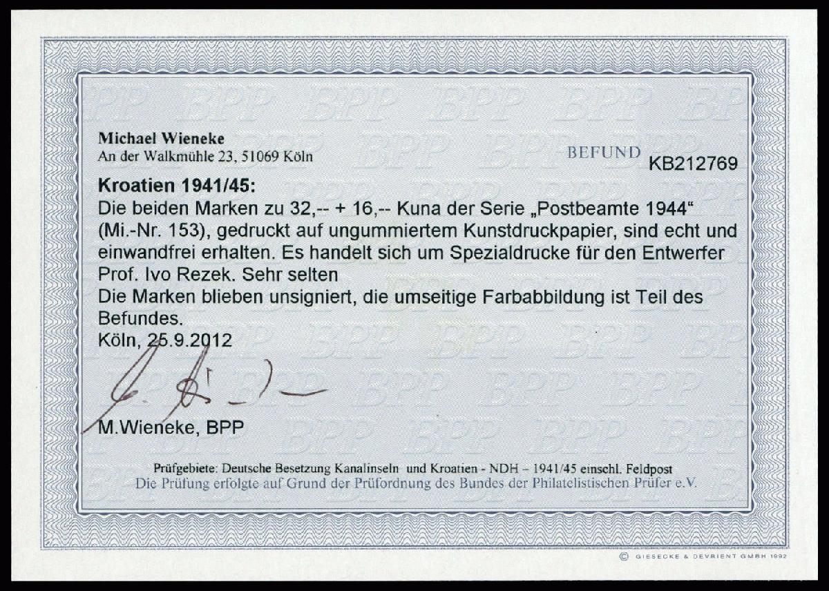 | Zusatzinformationen und Suchstichworte: | 76. Badische Briefmarken GmbH Auktion 27. Juni 2023 Los 16737 D Kroatien 1944, Zwei Probedrucke zu 32,-- + 16,-- Kuna der Serie „Postbeamte“ (in hellblau/dunkelblau und braun/rot), gedruckt auf ungummiertem Kunstdruckpapier. Es handelt sich um Spezialdrucke für den Entwerfer Prof. Ivo Rezek. Sehr selten! Befund Wieneke BPP anbei. Zuschlag 95,00 EUR |