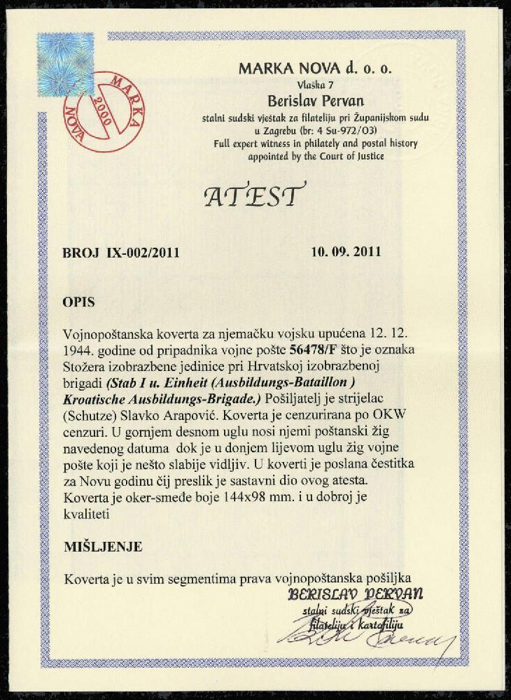 | Zusatzinformationen und Suchstichworte: | 76. Badische Briefmarken GmbH Auktion 27. Juni 2023 Los 16743 D Kroatien 1944, Feldpostfaltbrief (mit Inhalt, Neujahrskarte) vom 12.12.44, von einem Angehörigen der 17. Komp., I. Btl., kroatisches Ausbildungsbrigade (Fp.-Nr. 56478 F), Poststempel von Stockerau, Zensur der ABP Wien, (Fotoattest Pervan 10.09.2011), geprüft Wieneke BPP Zuschlag 15,00 EUR |