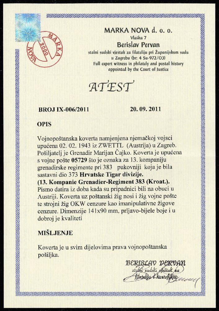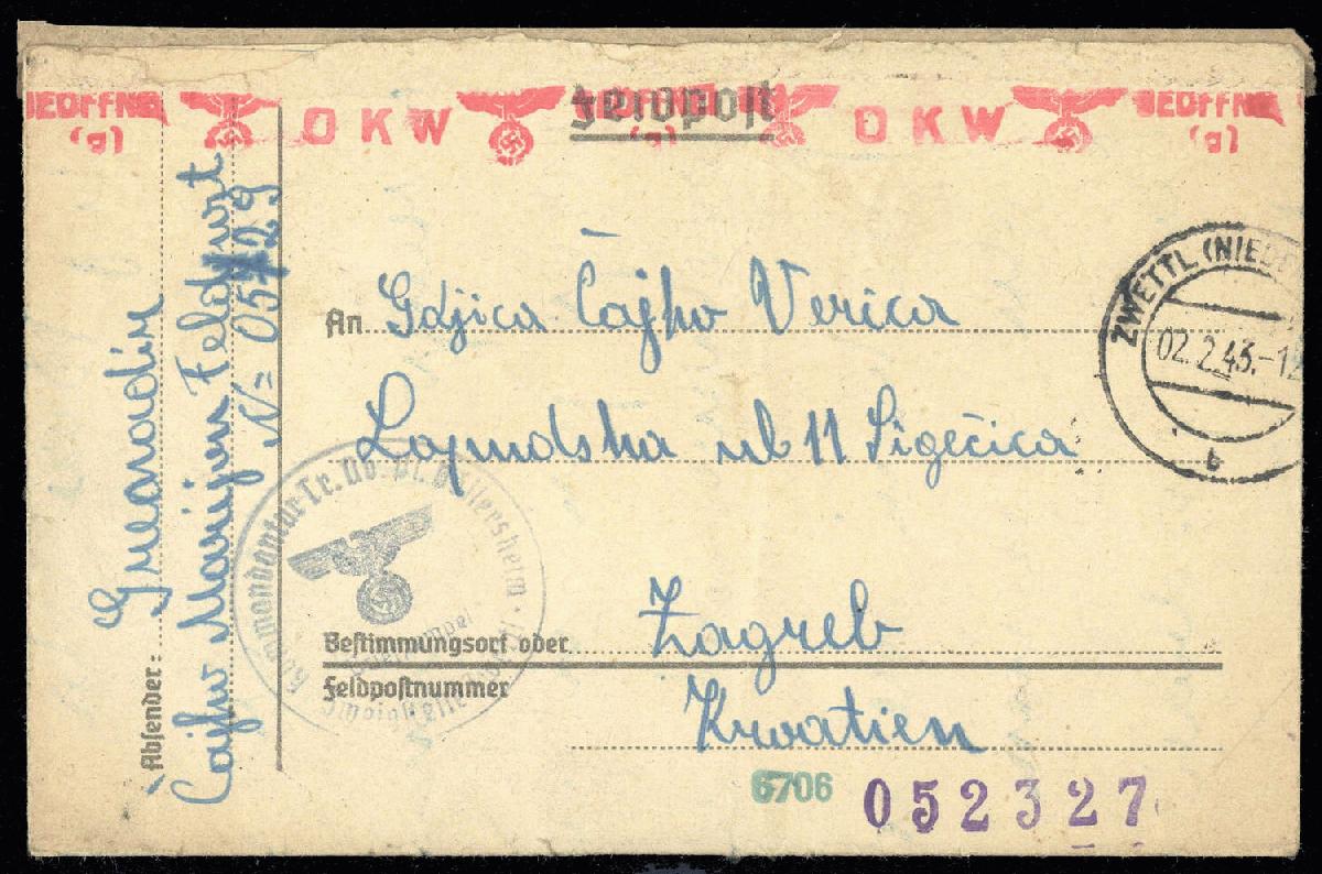 | Zusatzinformationen und Suchstichworte: | 76. Badische Briefmarken GmbH Auktion 27. Juni 2023 Los 16746 D Kroatien 1943, Feldpostfaltbrief vom 2.2.43, von einem Angehörigen der Fp.-Nr. 05729 (13. Komp., Gren.-Rgt. 383 der 373. (kroat.) Inf. Div. Sogen. TIGER-DIVISION) aus der Aufstellungsphase, offenener Briefstempel des Truppenübungsplatzes Döllersheim, Poststempel von Zwettl, Zensur der ABP Wien, (Fotoattest Pervan 20.09.2011), geprüft Wieneke BPP Zuschlag 36,00 EUR |