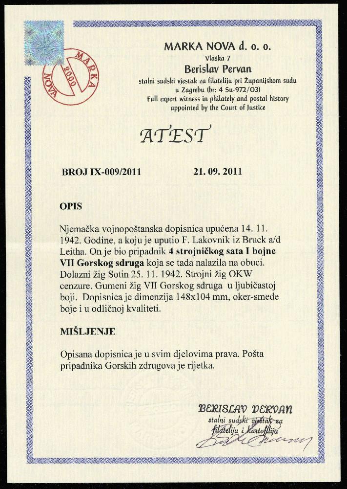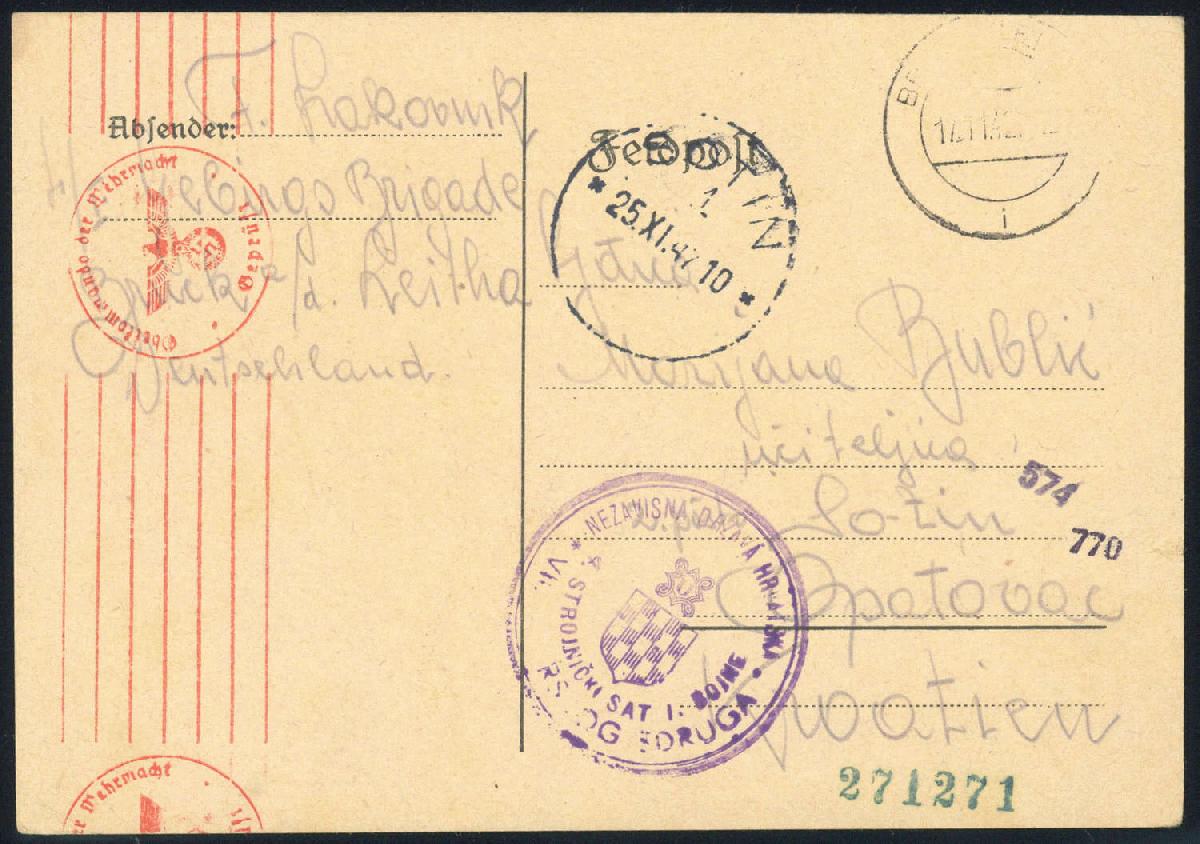 | Zusatzinformationen und Suchstichworte: | 76. Badische Briefmarken GmbH Auktion 27. Juni 2023 Los 16757 D Kroatien 1942, Feldpostkarte vom 17.11.42, von einem Angehörigen der 4. MG-Komp., I. Btl. der VII: Gebirgsbrigade der kroat. Domobranen-Armee in Bruck a.d.Leitha. Diese Brigade ist zur Aufstellung der 373. Inf. Div. (kroat.), sogenannte "Tiger"-Division genuzt worden, Zensur der ABP Wien, (Fotoattest Pervan 21.09.2011), geprüft Wieneke BPP Zuschlag 34,00 EUR |