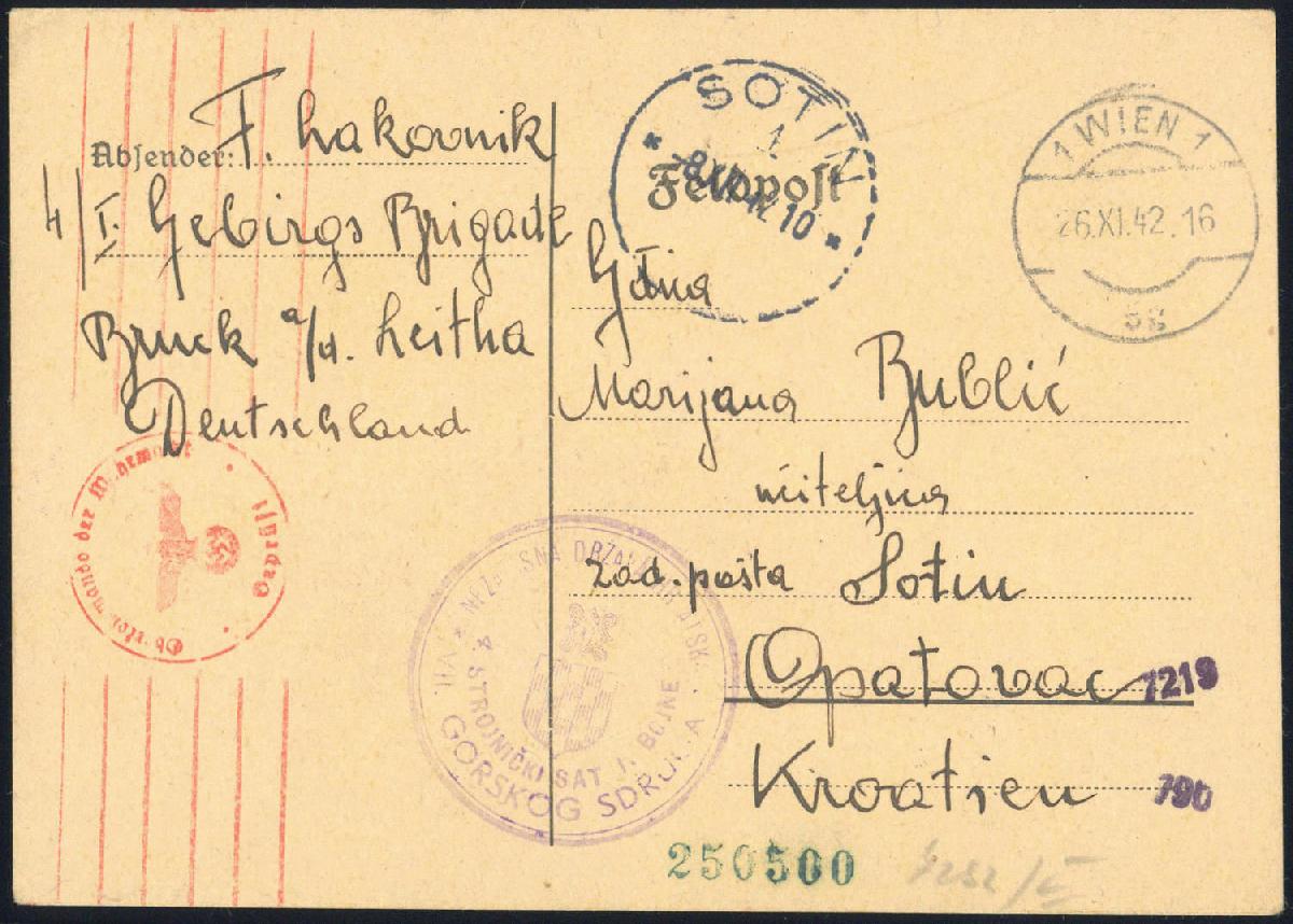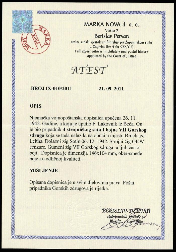 | Zusatzinformationen und Suchstichworte: | 76. Badische Briefmarken GmbH Auktion 27. Juni 2023 Los 16758 D Kroatien 1942, Feldpostkarte vom 26.11.42, von einem Angehörigen der 4. MG-Komp., I. Btl. der VII: Gebirgsbrigade der kroat. Domobranen-Armee in Bruck a.d.Leitha; Poststempel jedoch von Wien. Diese Brigade ist zur Aufstellung der 373. Inf. Div. (kroat.), sogenannte "Tiger"-Division genuzt worden, Zensur der ABP Wien, (Fotoattest Pervan 21.09.2011), geprüft Wieneke BPP Zuschlag 38,00 EUR |