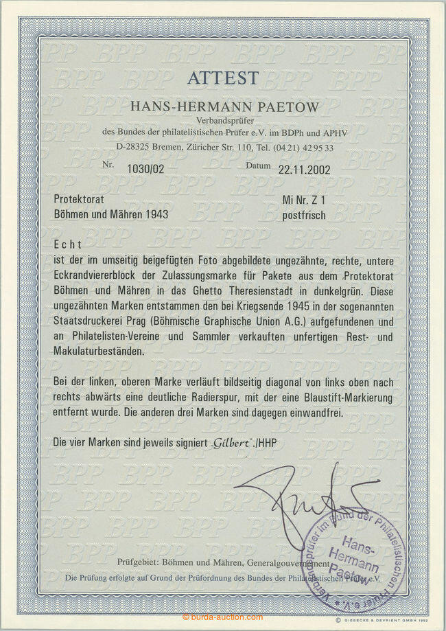 | Zusatzinformationen und Suchstichworte: | Burda 72. Auktion 16. - 17. September 2023 Los 3098 Böhmen und Mähren Theresienstadt 1943 Pof.Pr1B, Admission stmp, imperforated in/at right bottom ROHOVEM 4-BLOKU; mint never hinged piece mint never hinged, certificate Paetow BPP, exp. by Gilbert., extraordinary offer nezoubkovaneho block of four terezinskych stamps, spickova item every big collection Terezin and Protectorate! Ausruf 2.128,00 EUR |